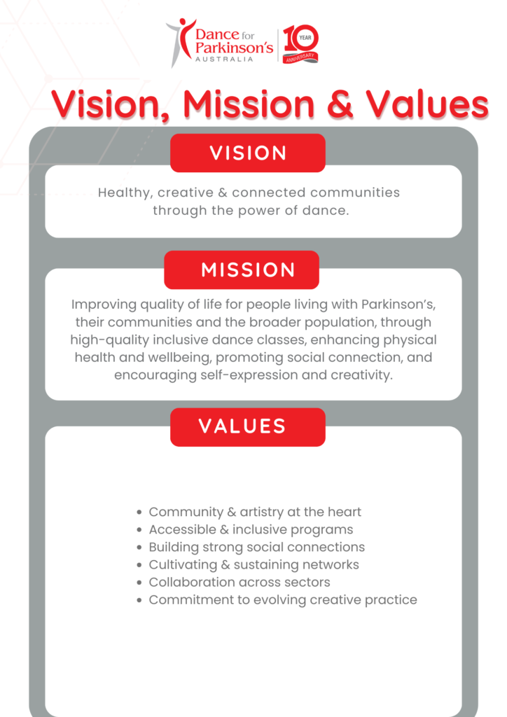 Dance for Parkinson’s Australia (DPA) provides high quality services to people living with Parkinson’s Disease (PD), partners, carers, friends, and the broader community of seniors. Established in Australia in 2013, our goal is to provide opportunities to improve quality of life and encourage arts, health and well-being in creative ageing. Our primary activities focus on providing accessible dance classes for the Parkinson’s community and broader communities of seniors. We also provide training and professional development and are leaders in creative ageing best practice. 2023 celebrates ten years of delivering the program, classes and workshops in Australia.